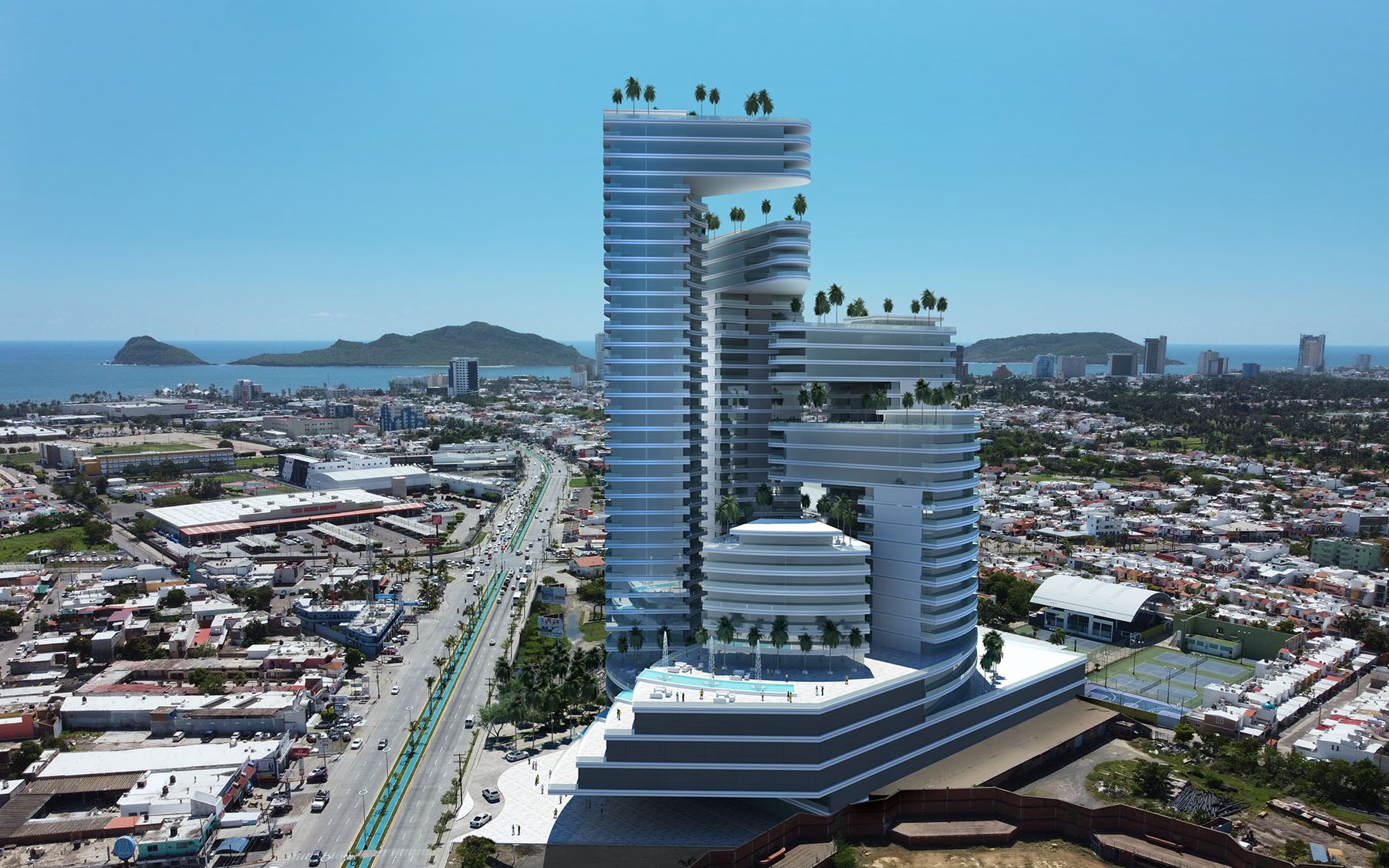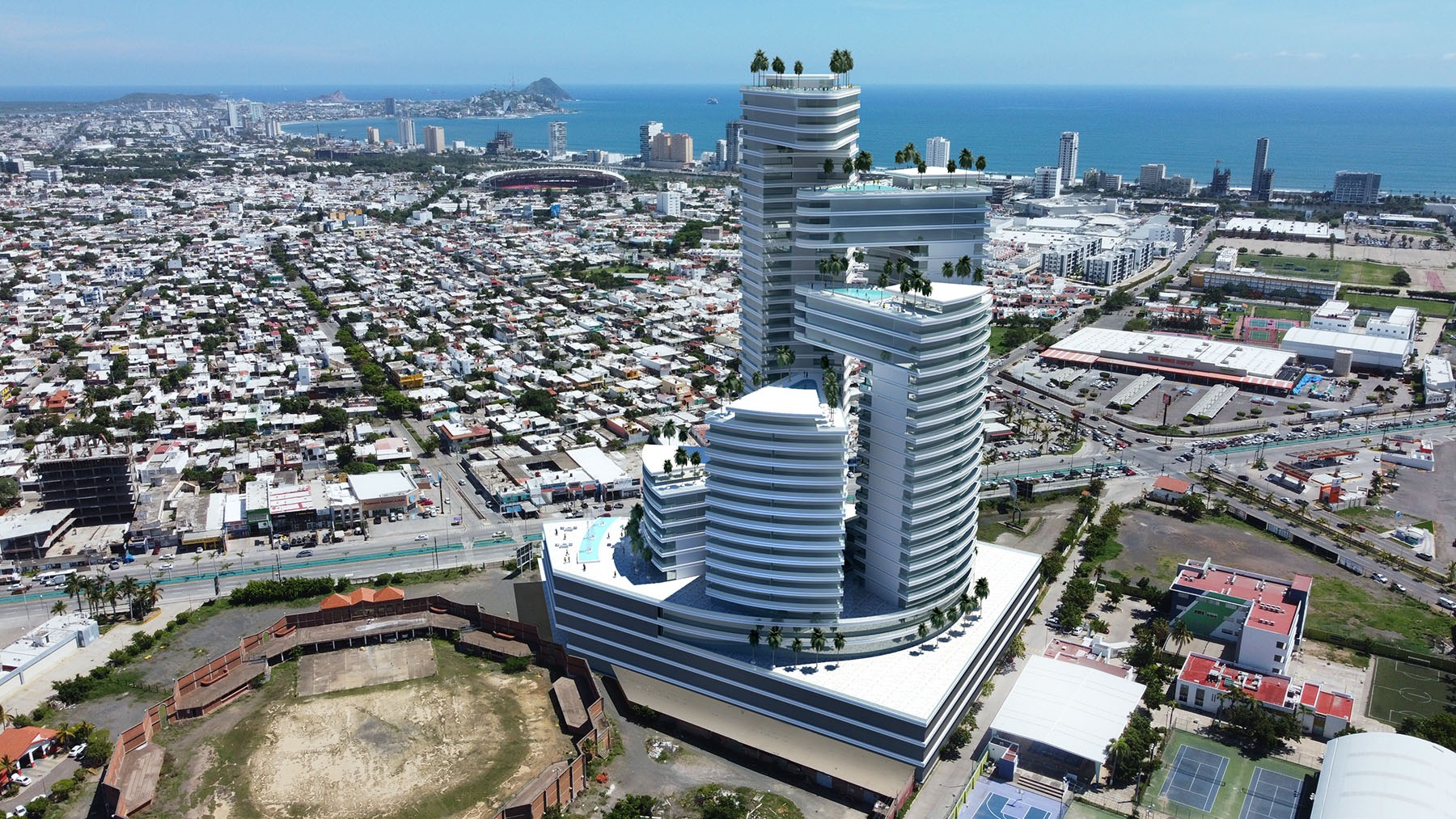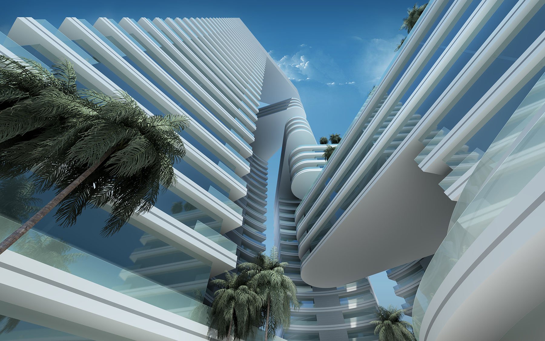 Proyecto de arquitectura escultórica formado por 5 edificios radiales y concéntricos que de forma gradual y escalonada forman un solo elemento con ritmo, movimiento y dinamismo, logrando así una gran obra de arte.
