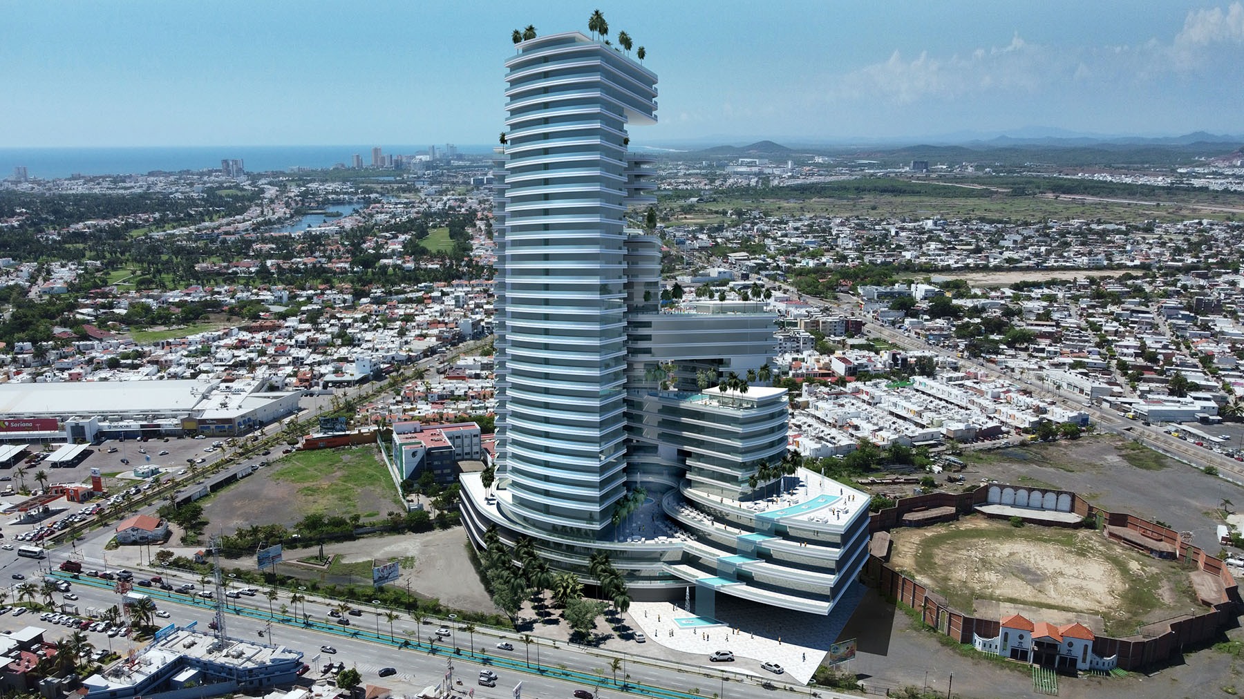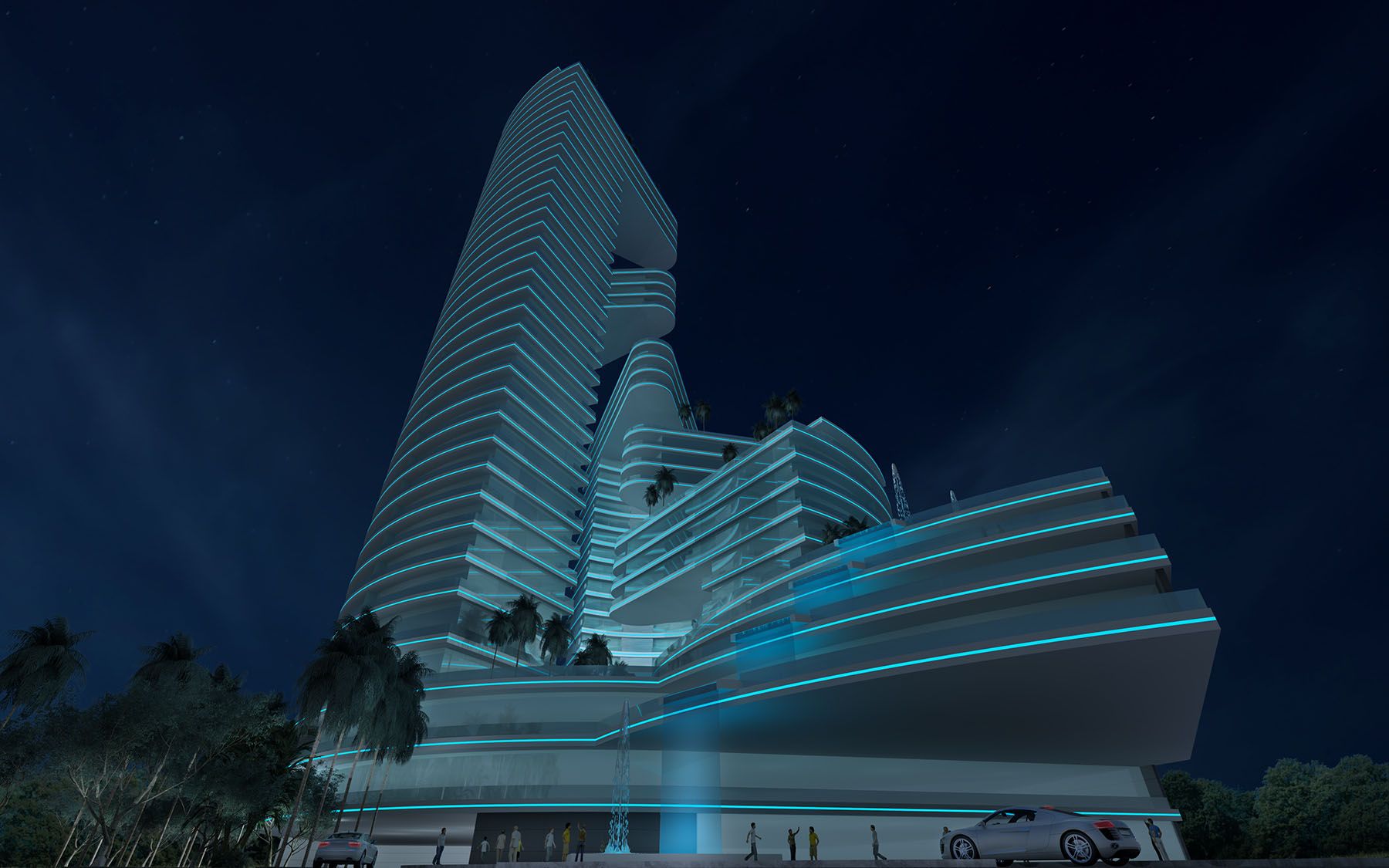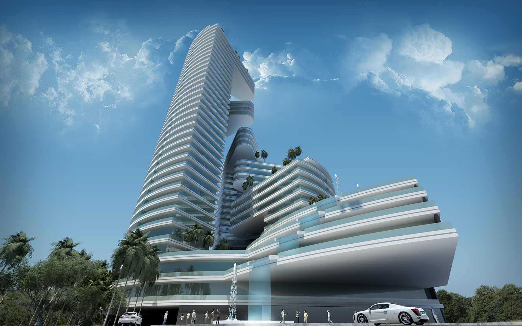 Proyecto de arquitectura escultórica formado por 5 edificios radiales y concéntricos que de forma gradual y escalonada forman un solo elemento con ritmo, movimiento y dinamismo, logrando así una gran obra de arte.
